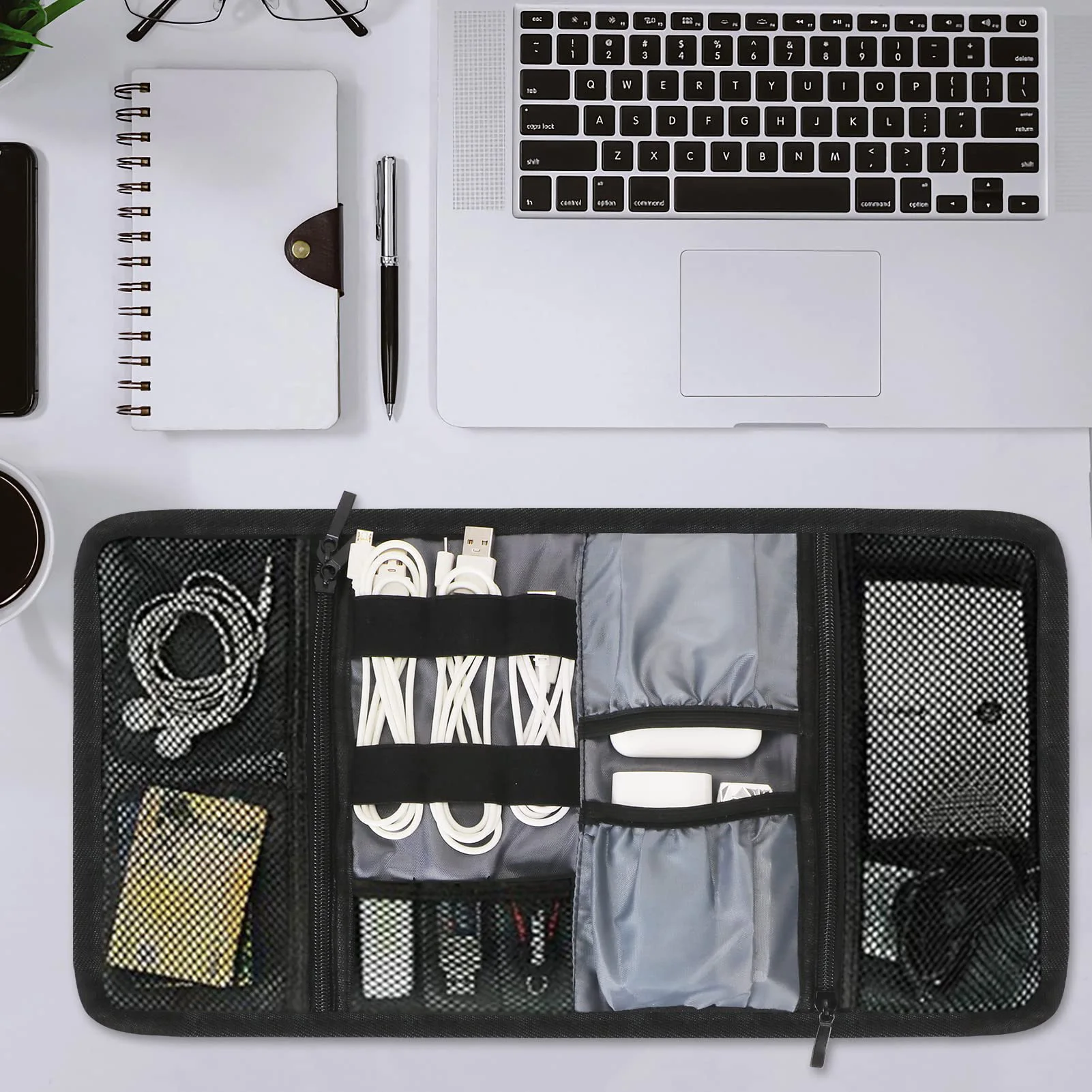 It keeps power banks, cables, chargers, and other digital devices neatly organized.